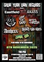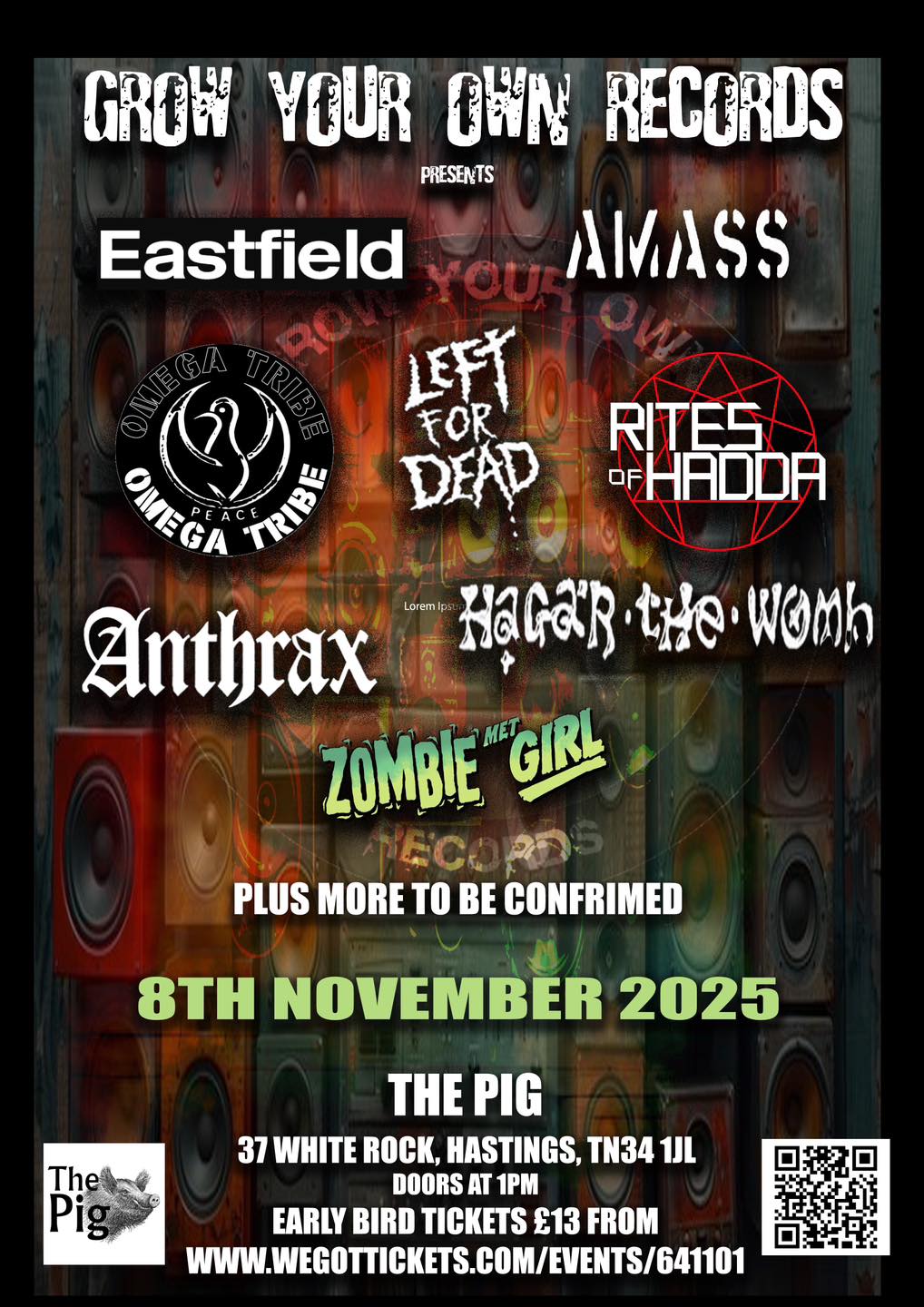 Saturday 8 November 2025 - HASTINGS The Pig. 37 White Rock, TN34 1JL. Grow Your Own Records event with Eastfield, Amass, Omega Tribe, Left for Dead, Rites of Hadda, Anthrax, Hagar the Womb and Zombie Met Girl. 10.20 - 11.00 Eastfield 9.30 - 10.05 Hagar the Womb 8.40 - 9.15 Omega Tribe 7.50 - 8.25 Amass 7.00 - 7.35 Rites of Hadda 6.15 - 6.45 Zombie Met Girl 5.15 - 5.45 Anthrax 4.30 - 5.00 Left For Dead 3.45 - 4.15 Ancient Lights 3.00 - 3.30 Proud City Fathers 2pm DoorsTickets £13 from www.wegottickets.com/event/641101/ www.facebook.com/Growyourownrecords | ![]() |