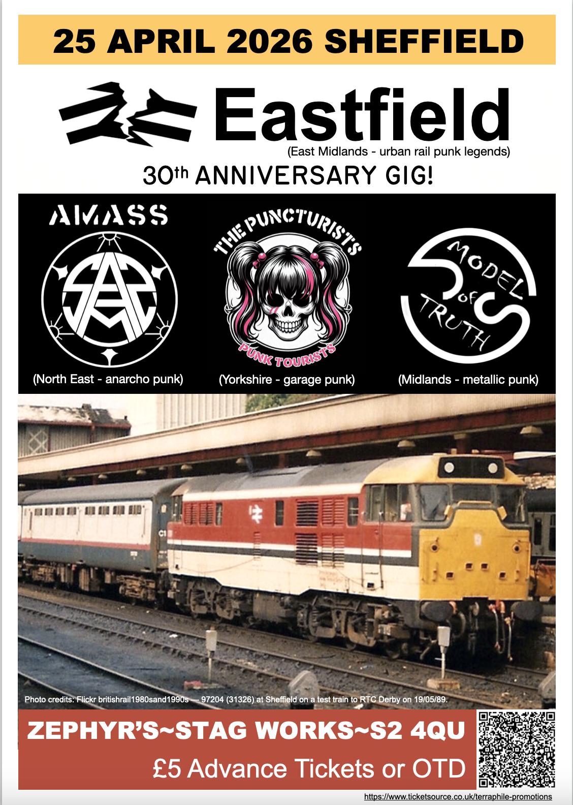 Saturday 25 April 2026 - SHEFFIELD Zephyr's Stag Works, 84 John Street, Highfield, Sheffield, S2 4Q. Anniversary of first ever gig. Doors open at 19:00 19:30 - 20:00 MODEL OF TRUTH 20:15 - 20:45 THE PUNCTURISTS 21:00 - 21:30 AMASS 21:45 - 22:30 EASTFIELDTickets £5 advance or OTD. https://www.ticketsource.co.uk/terraphile-promotions/t-gaqygak | ![]() |