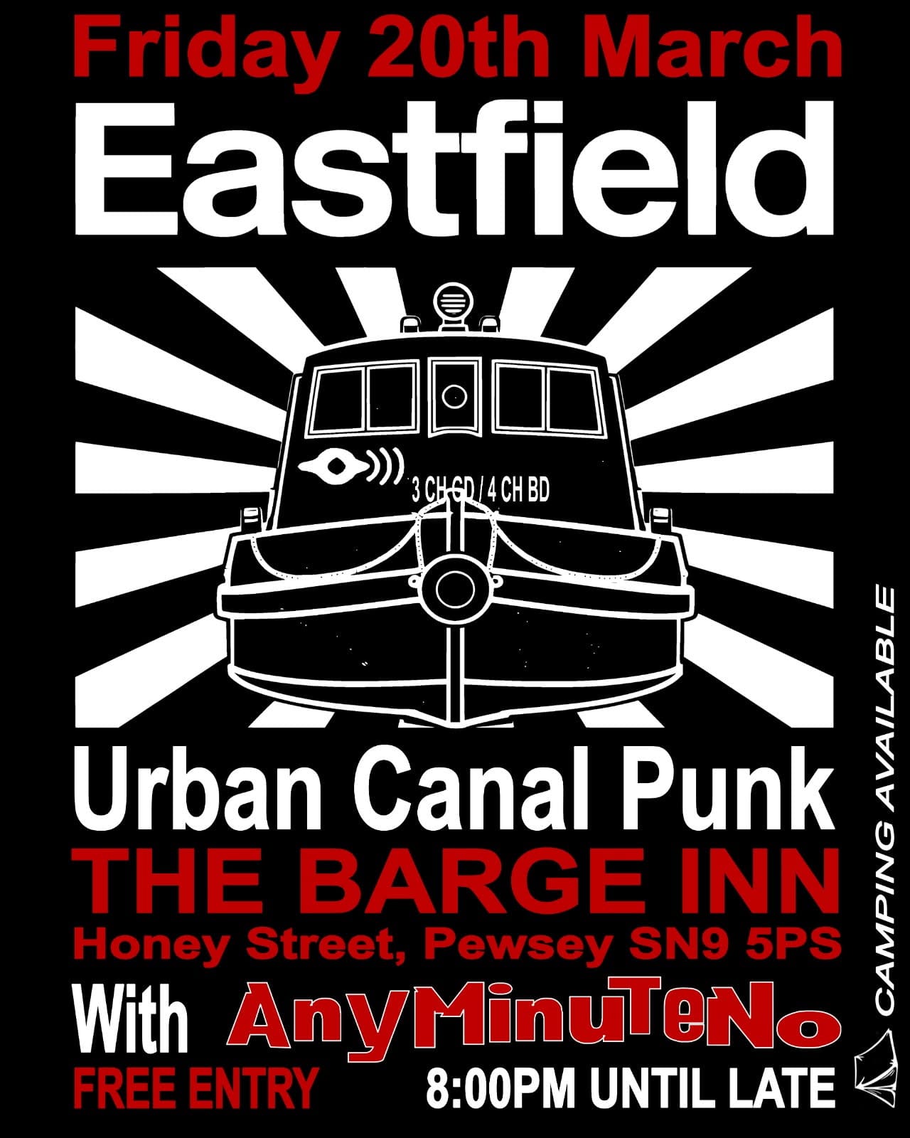 Friday 20 March 2026 - HONEYSTREET The Barge Inn. Honeystreet, Pewsey, Wiltshire SN9 5PS. Eastfield and Any Minute No. 8pm start. Free entry. the pub has a campsite: www.thebargeinnhoneystreet.uk | ![]() |