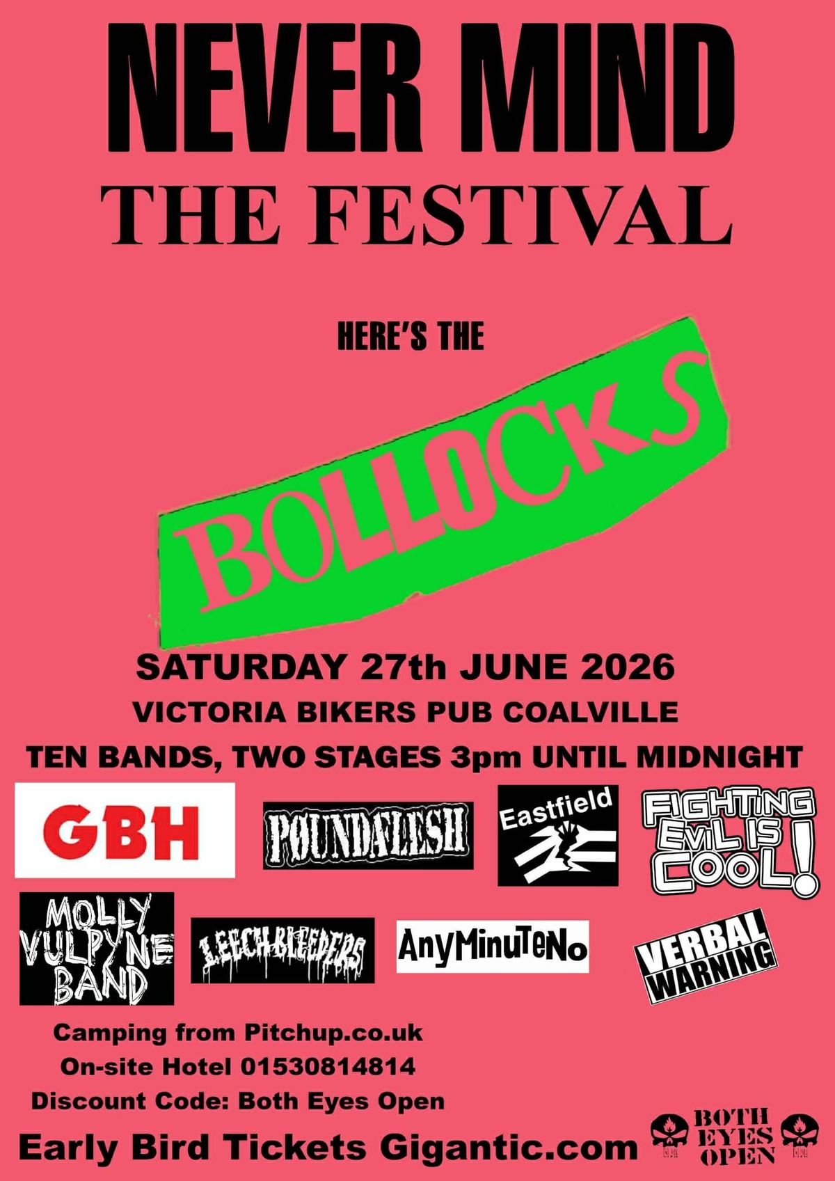 Saturday June 27 2026 - COALVILLE Victoria Bikers Pub. (outside stage!) Whitwick Road, Coalville, Leicestershire LE67 3FA. GBH, Poundaflesh, Eastfield, Fighting Evil is Cool!, Molly Vulpyne Band, Leech Bleeders, Any Minute No, Verbal Warning + 2 more. 3pm to midnight, Camping available. A Both Eyes Open event. Tickets from: www.gigantic.com | ![]() |