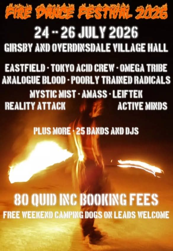 Saturday 25 July 2026 - FIRE DANCE FESTIVAL. Girsby and Over Dinsdale Village Hall, near Darlington DL2 1PP. Details to follow, basics at: www.fatsoma.com/e/by1y4j94/fire-dance-festival-2026 | ![]() |